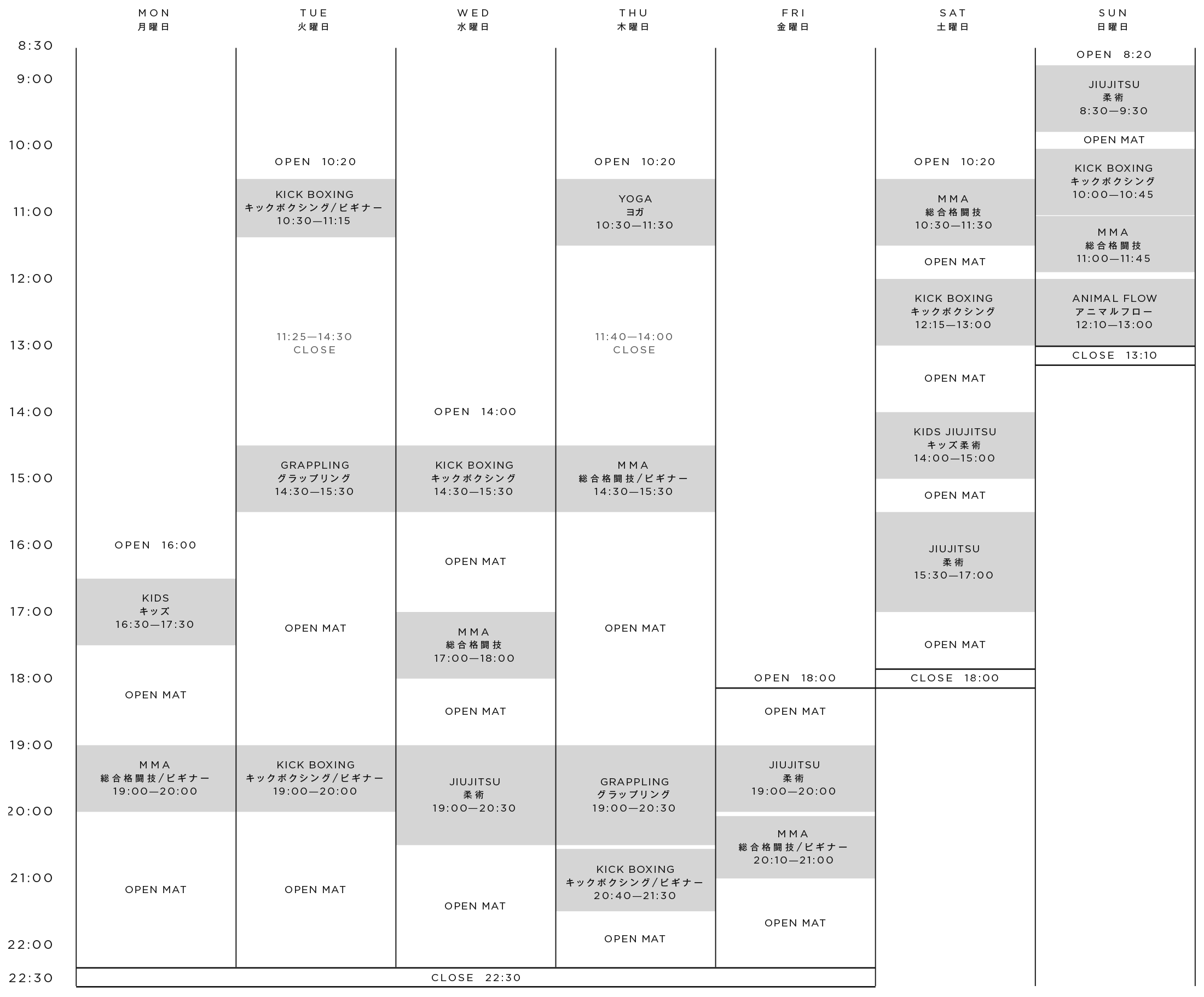 柔術クラスは柔術衣、その他のクラスはTEEシャツと金具の付いていないハーフパンツ等で行います。